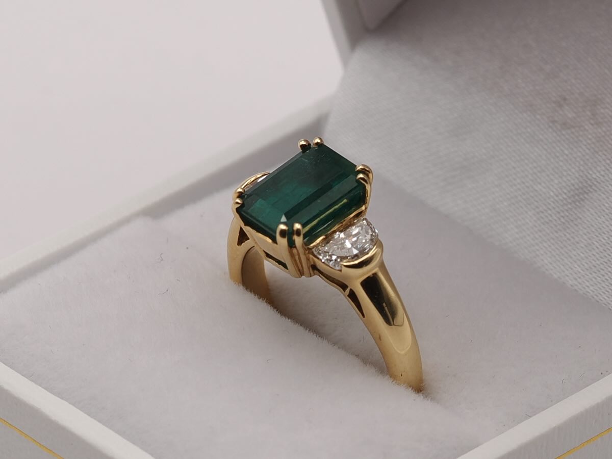 #BagueÉmeraude #BijouterieCastiella #OrJaune18Carats #ÉmeraudeBaguette #DiamantsDemiLune #JoaillerieTarbes